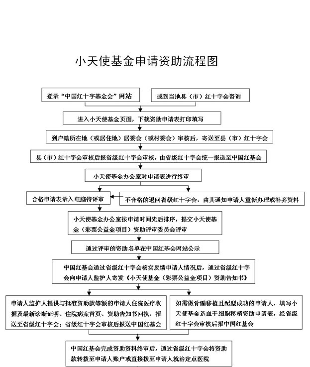 1.登录中国红基会网站(网址:http://www.crcf.org.cn/) ,从小天使基金页面下载最新的《小天使基金资助申请表》,按要求填写,经申请人户籍所在地(或居住地)村委会(居委会)审核盖章后,寄送至县(市)级红十字会审核,经省级红十字审核后报中国红基会;