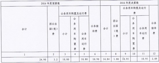 2016年度“三公”经费财政拨款支出预算为24.90万元,其中:因公出国(境)费预算3.20万元,公务用车购置及运行费预算10.80万元,公务接待费预算10.90万元。支出决算为14.84万元,完成预算的59.60%,其中:因公出国(境)费支出决算为1.80万元;公务用车运行费支出决算为10.95万元;公务接待费支出决算为2.09万元。